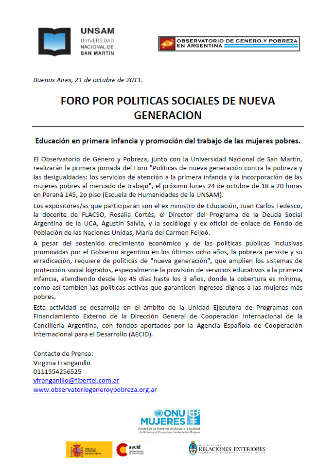 El Observatorio de Género y Pobreza, junto con la Universidad Nacional de San Martín, realizarán la primera jornada del Foro "Políticas de nueva generación contra la pobreza y las desigualdades: los servicios de atención a la primera infancia y la incorporación de las mujeres pobres al mercado de trabajo", el próximo lunes 24 de octubre de 18 a 20 horas en Paraná 145, 2o piso (Escuela de Humanidades de la UNSAM).